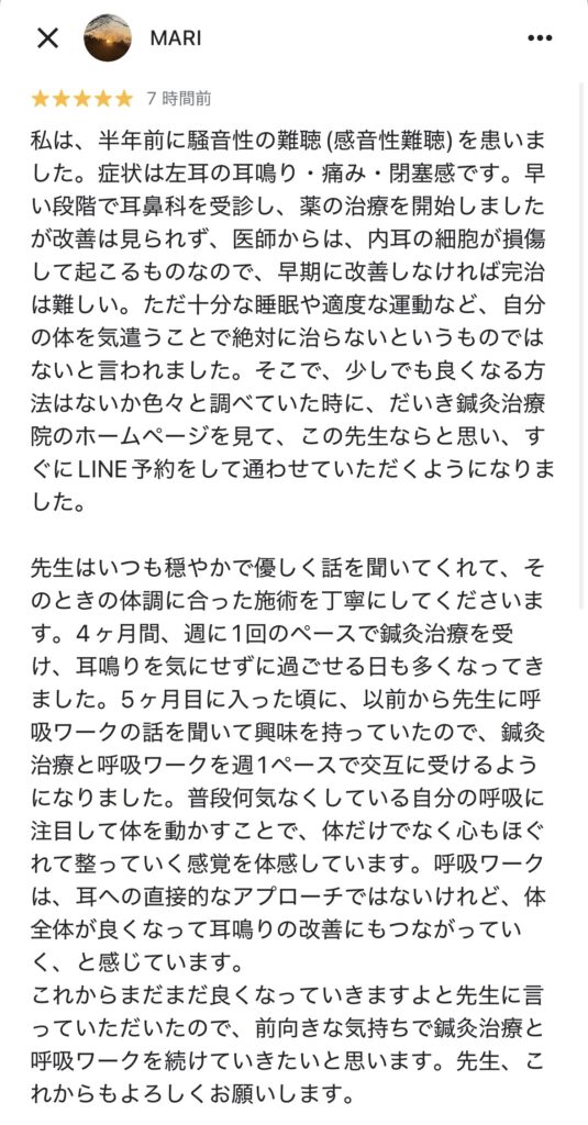 睡眠不足や疲れがたまっている時、つまり身体に余裕がないと、耳鳴りの症状も強くみられる傾向があるように感じます。Mさんも寝不足の時は、いつもより耳鳴りが気になるようでした。